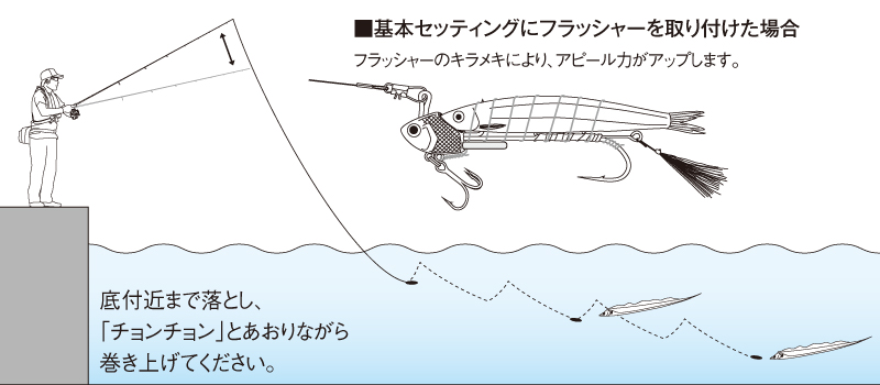 「ドジョウ」「キビナゴ」「イワシ」等の生エサはもちろん、ワームも取り付けることができるベースに、ベイトフィッシュライクなヘッド、さらに発光チューブやアシストフック、ブレード等、パーツを簡単に取り付けることができる装備をプラス。お好みや状況に応じて様々なカスタマイズが可能です。